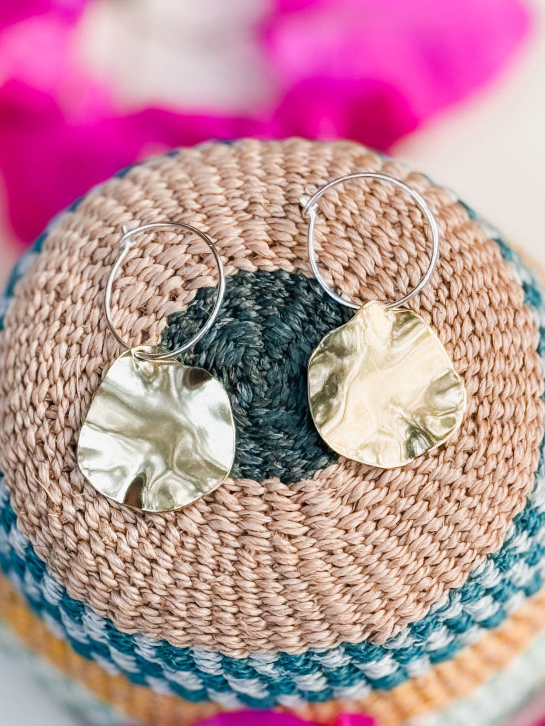 Love the way autumn leaves dance in the breeze? A Bird Named Frank captured that magic in these mixed-metal earrings handmade in Cape Town, South Africa. Each pair features a gently rippled brass disk, swinging from 18mm sterling silver hoops. Simple but stunning, just like nature itself.
