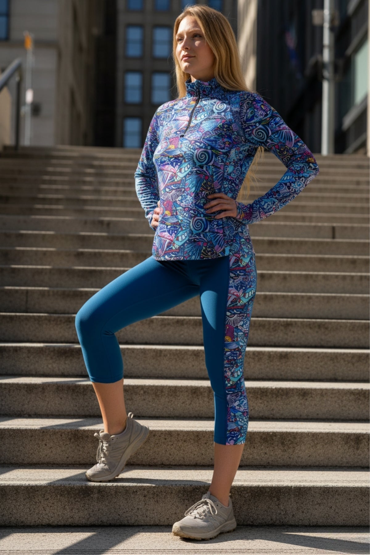 - Quarter-zip front with stand collar for adjustable ventilation and sun protection