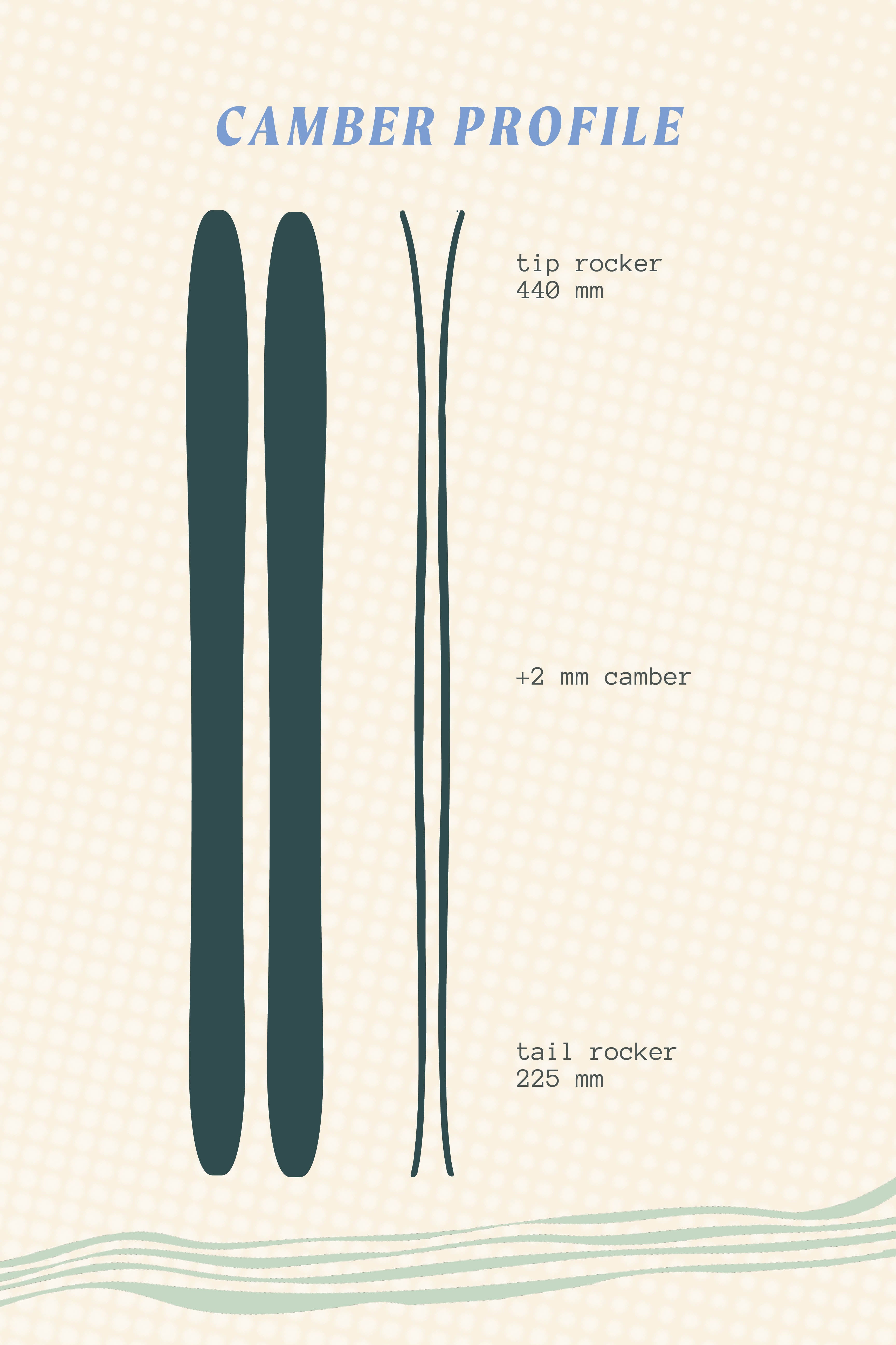 Tip and Tail Rocker (480 mm tip / 225 mm tail) with 2mm camber underfoot.