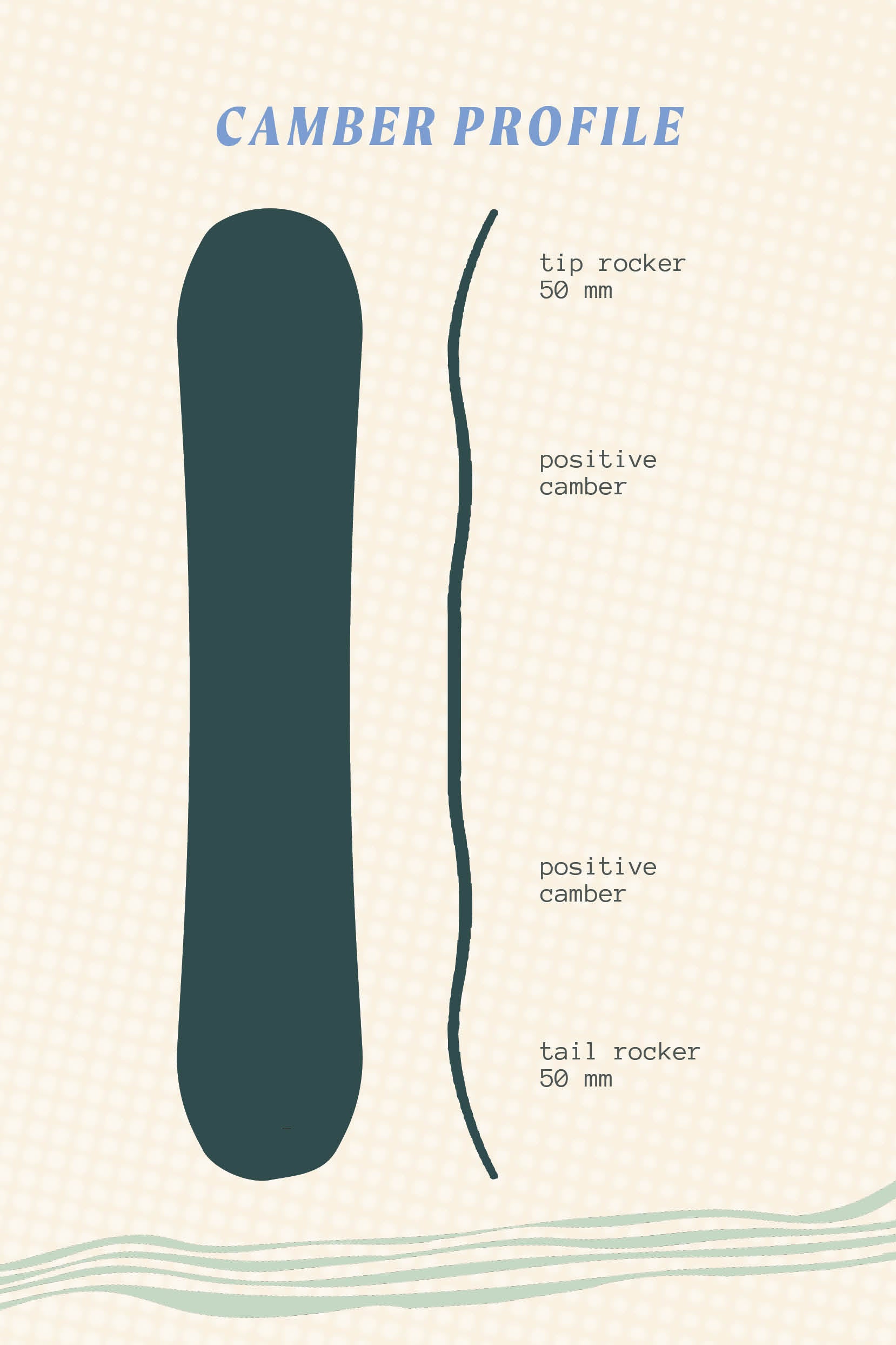 ✔️ 50 mm of rocker in the tip and tail gives you fun float in the pow and loves to butter and flex on the snow