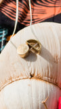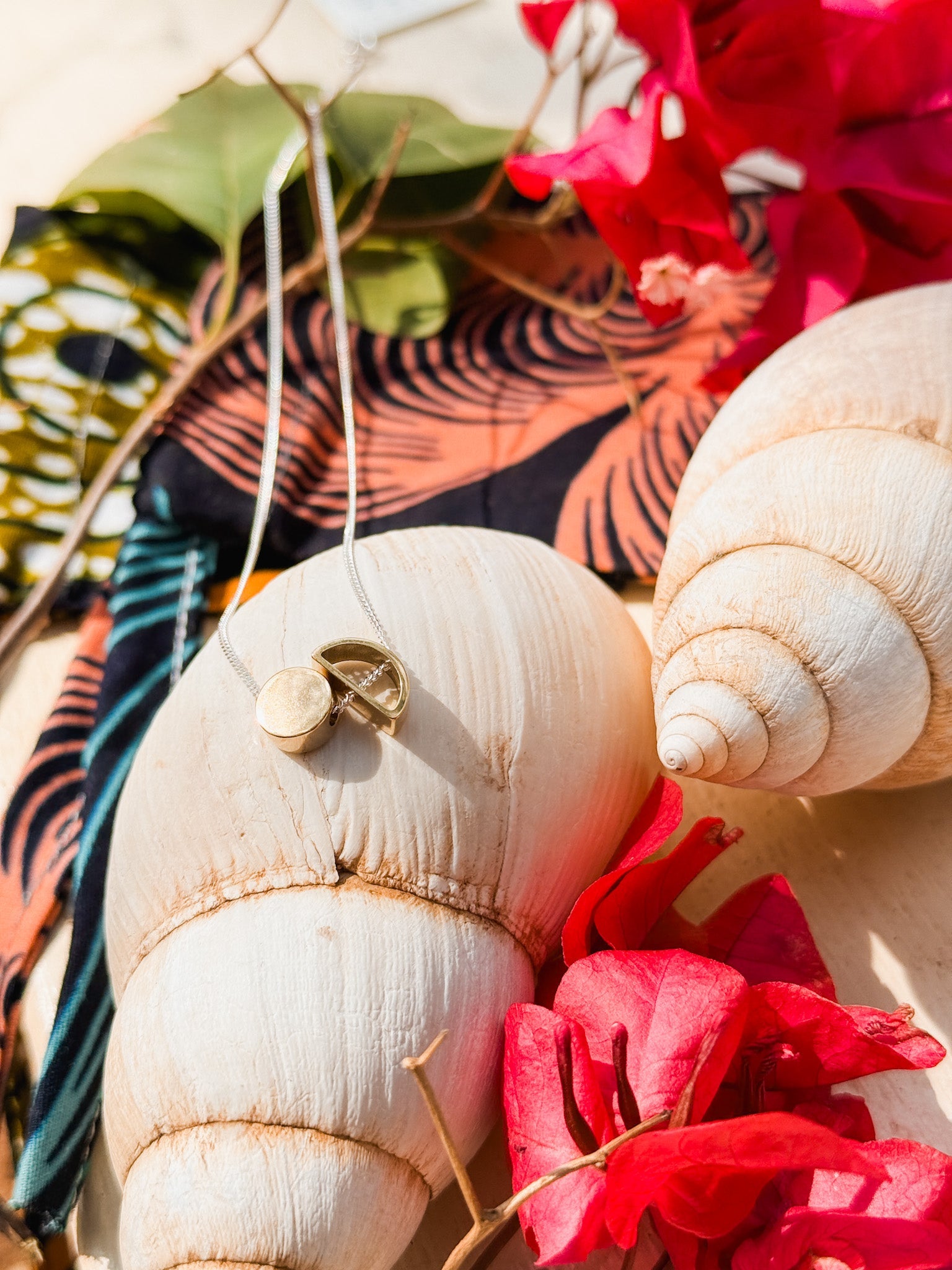 A polished brass solid circle (7mm) with a hollow half-moon (10mm) on a 420mm sterling silver chain