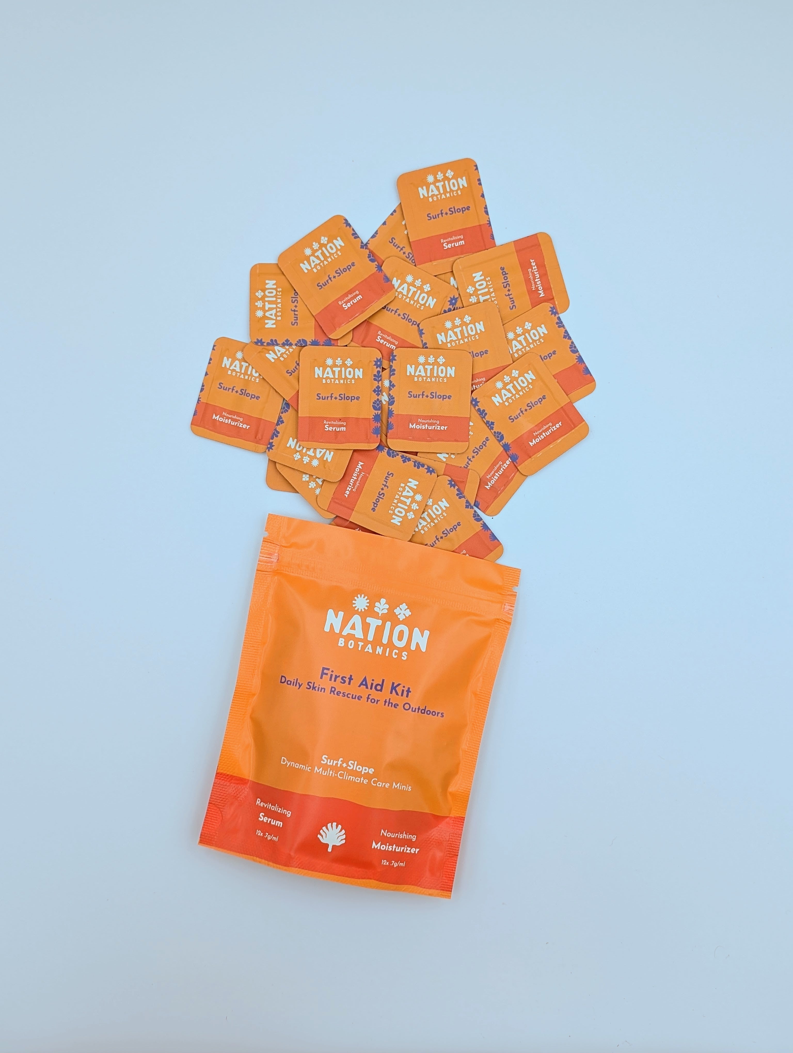 Nation Botanic's First Aid Kit includes 12 sample sets of Surf+Slope’s Revitalizing Serum and Nourishing Moisturizer duo (24 total). This super-clean, super-charged duo is your all-in-one skin rescue for the outdoors, so you can forget overwhelming skincare!